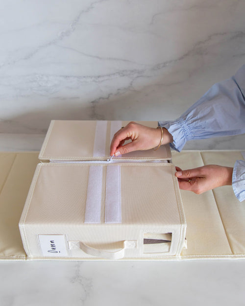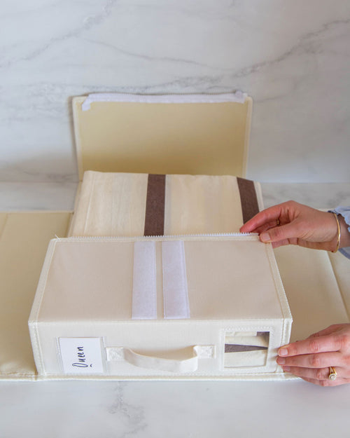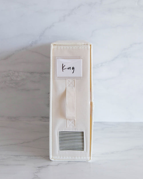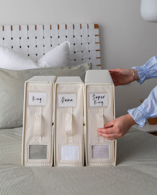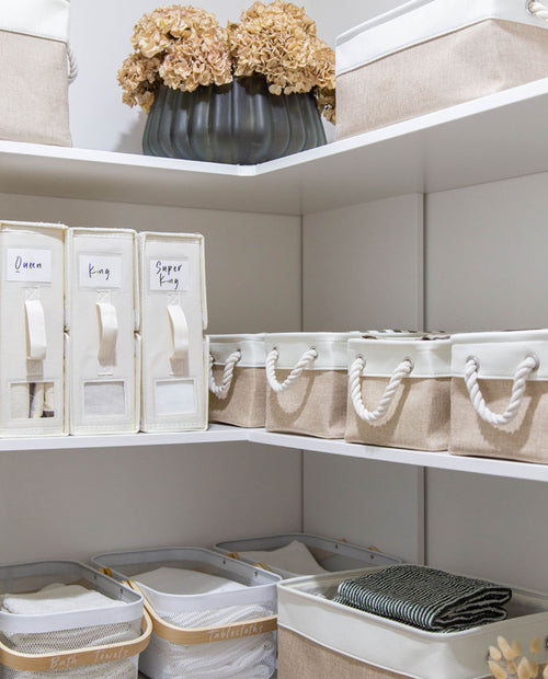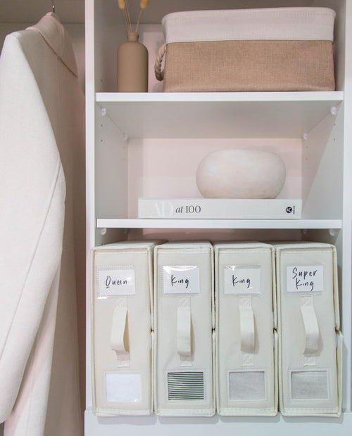 Keep your linen cupboard neat and stress free with our Bed Sheet Organiser. This clever storage solution makes it easy to sort, store and differentiate between your various sheet sizes. Stackable, portable and space saving - your linen game just got an upgrade!