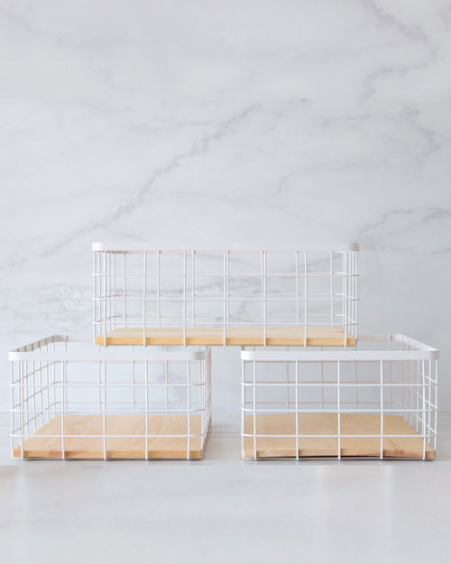 - 3x white wire baskets with wooden tray (Length 32cm x Height 12.5cm x Width 22.5cm)