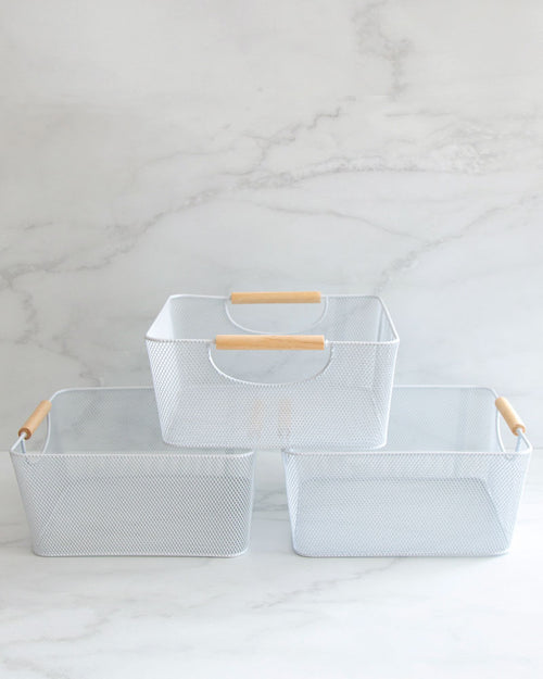 - 3x white mesh baskets with wooden handle (Length 26cm x Height 12cm x Width 26cm)