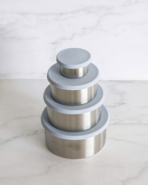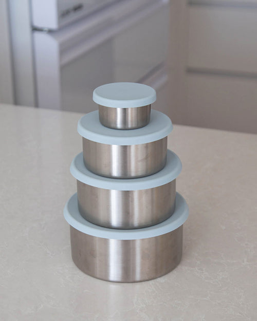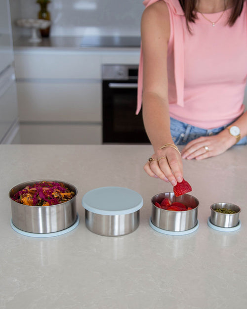 Say hello to our plastic free food storage containers. Our set includes 4x sizes perfect for storing a wide variety of food. Our smaller sizes are perfect for sauces, dressings, yoghurt, nuts, seeds, fruit and more. And our larger sizes are perfect for leftovers, soups, salads, or as a work/school lunchbox. Featuring a leakproof silicone lid, they are perfect for everyday use!