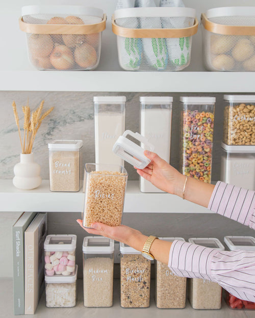 Everything you need to transform your space is included in our Deluxe Pantry Storage Container Set. Our airtight Containers are a pantry must-have, as well as our stylish and multi-purposeful Baskets with Wooden Handles. Every container size in this set is stackable, allowing you to maximise space in your pantry.