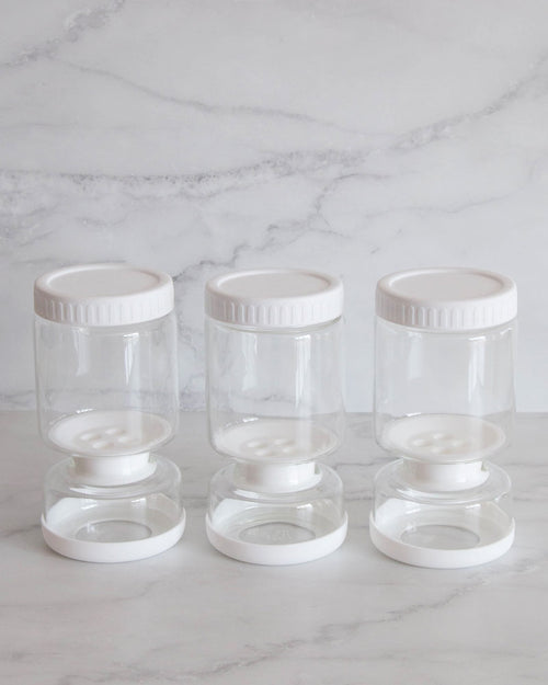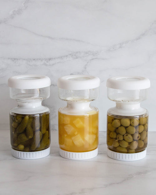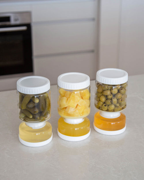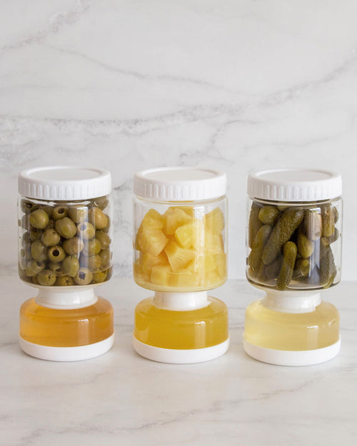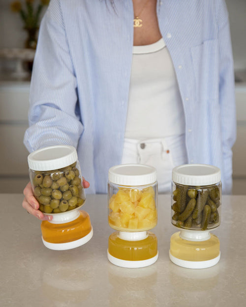 In a pickle with how to store your pickles? Our Glass Pickle Jars are made in an hourglass shape so you can store ingredients in their brine when not in use, and then flip it over to separate the brine when in use. Perfect for storing pickles, olives, jalapeños and bocconcini.
