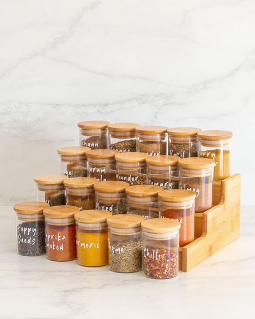 Our Bamboo Spice Rack is the perfect companion for our Herb & Spice Set. Display on your kitchen bench, next to your splashback, or in your pantry - reaching for your herbs & spices has never been so easy (or stylish!) Customised specifically to fit our herb & spice jars.
